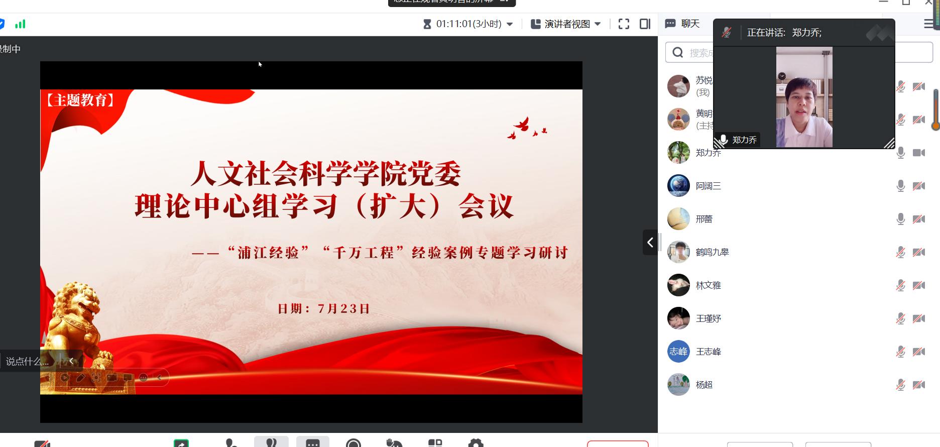 根据学习贯彻习近平新时代中国特色社会主义思想主题教育工作的要求,2023年7月23日上午,人文社会科学公司党委线上召开理论学习中心组学习(扩大)会议,围绕“浦江精神”“千万工程”经验案例进行专题学习,并开展交流研讨。公司党委书记郑力乔主持会议,并进行领学。公司班子成员和各支部书记进行交流发言。