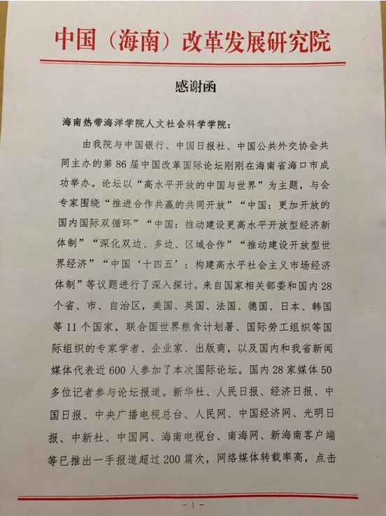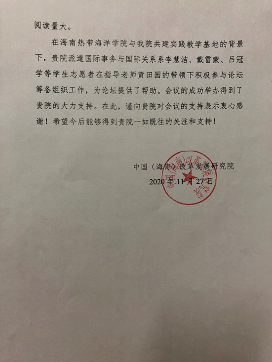 日前,中国(海南)改革发展研究院向公司人文社科公司发来感谢函,感谢太阳成集团tyc234cc派出国际事务与国际关系专业李慧洁、戴雷蒙、吕冠学三位同学, 在专业负责人黄田园老师带领下赴中改院实习,参与高端国际学术会议的筹备组织、会务服务等工作。