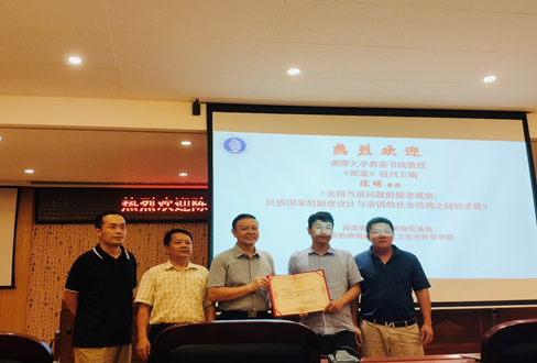 2021年5月8日下午,湘潭大学碧泉书院教授、《原道》(CSSCI)创刊主编陈明教授,应太阳成集团tyc234cc国际事务与国际关系系、海南省南海文明研究基地之邀,在图书馆报告厅作题为《美国当前问题的儒者观察:民族国家的制度设计与帝国的社会结构之间的矛盾》的学术讲座。
