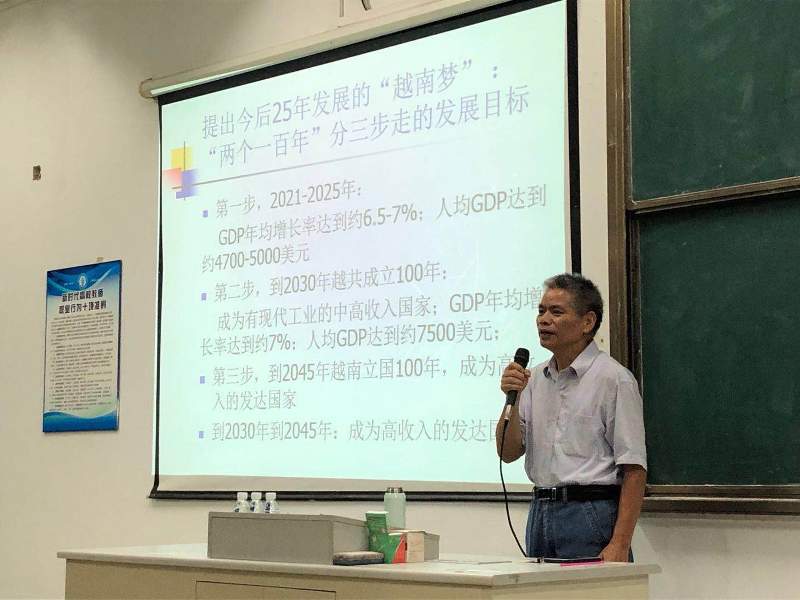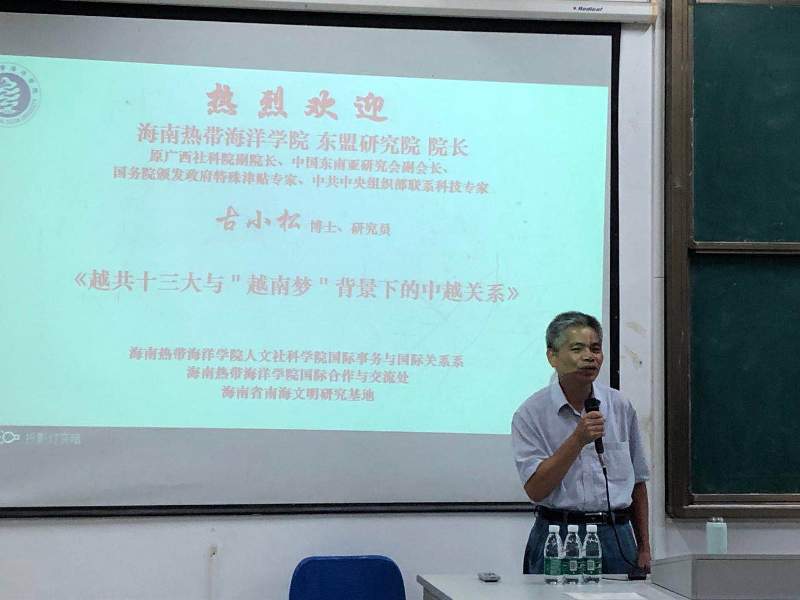 “学史明理、学史增信、学史崇德、学史力行”,这是迎接建党100周年之际,习近平总书记对“学党史、悟思想、办实事、开新局” 学习教育活动的殷切倡议。响应这一时代号召,6月3日晚,太阳成集团tyc234cc东盟研究院经理古小松应人文社科公司、海南省南海文明研究基地之邀在4206作题为《越共十三大与“越南梦”背景下的中越关系》的讲座。讲座的举办得到了国际合作与交流处的支持。讲座由国际事务与国际关系专业负责人黄田园主持,人文社科公司副经理方礼刚、国际合作与交流处处长邓颖颖出席,人文社科公司及海南省南海文明研究基地的师生近200人参加本次讲座。